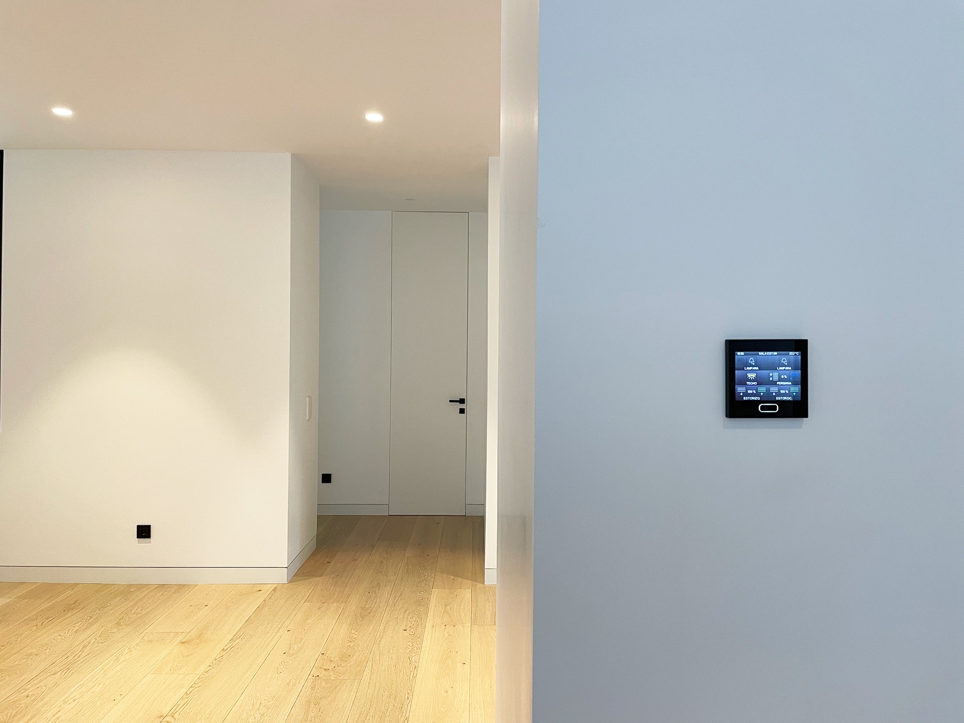 • ✔ Eliminación del exceso de mecanismos en pared: Una vivienda convencional puede acumular hasta 10 mecanismos por estancia (interruptores, reguladores, termostatos…). Con domótica, todos los controles se integran en un único display o se sustituyen por control remoto, mejorando la limpieza visual del espacio.
